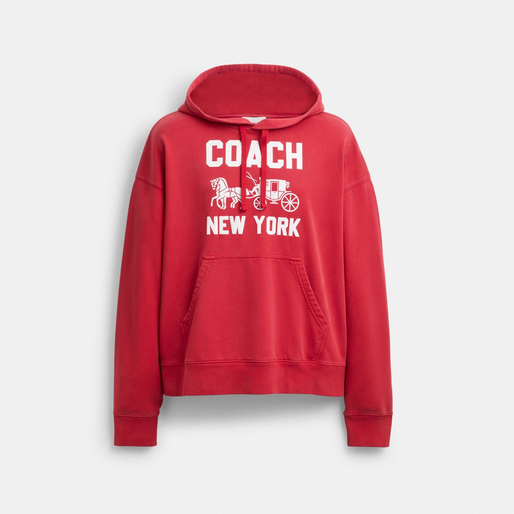 This relaxed-fit cotton sweatshirt is printed with a Coach graphic featuring our iconic Horse and Carriage motif. Garment-washed for a soft, lived-in feel, the hoodie is finished with a kangaroo pocket and ribbed trim.